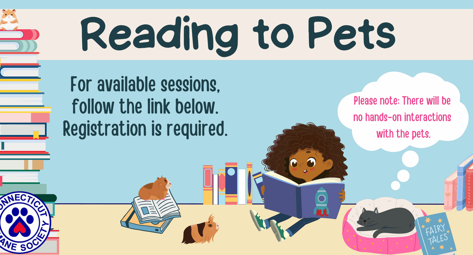 · Participants will read to cats or small pets, such as rabbits, guinea pigs, or birds. CHS staff are unable to take requests, and available pets will be selected in advance by staff. To best care for the pups at CHS, dog kennels are closed to the public and will not be accessible during this program.