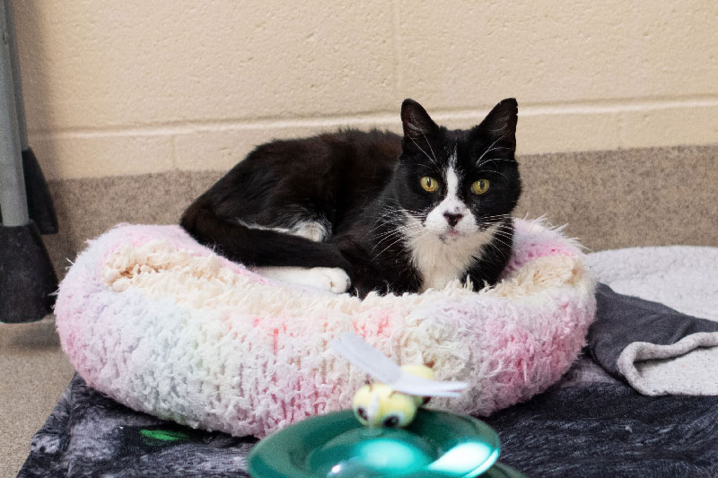 This kitty cat’s early days are a mystery that may never be revealed. Found as a stray in Mystic late last autumn, Pug made his way to the Connecticut Humane Society with no background, no collar or microchip, and no explanation for why this 11-year-old tuxedo-clad gentleman had been living on his own.