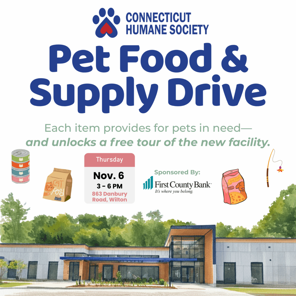 Support pets in Fairfield County at the new Connecticut Humane Society pet resource center in Wilton! When you bring a donation to the new location at 863 Danbury Road, Wilton, CT, on Wednesday, November 6th, from 3pm-6pm, you’ll get a free tour of the incredible new building.