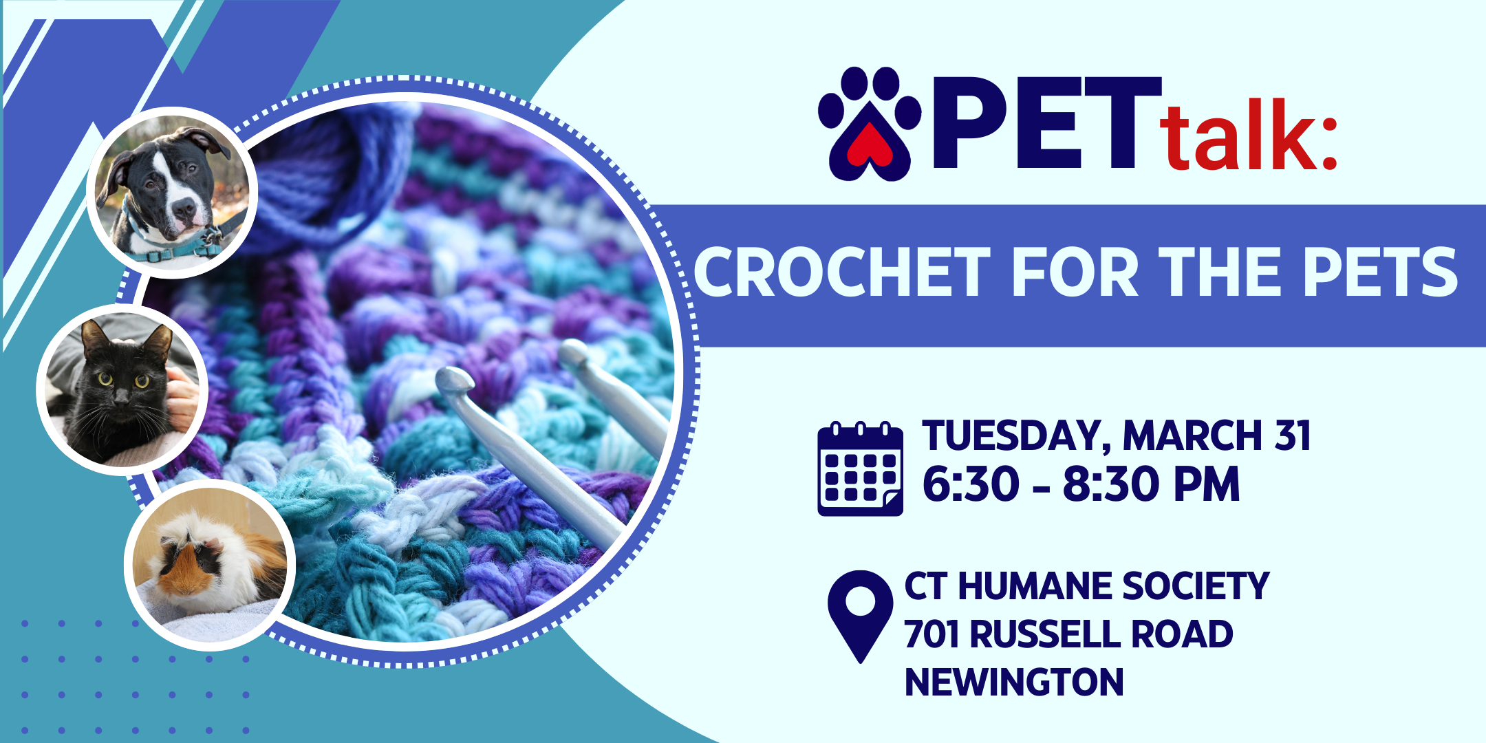 Virtual , United StatesJoin a guided workshop to crochet a pet blanket for your furry friend or a CHS pet. No experience needed—perfect for all skill levels! Join CHS for a fun-filled night of crochet. An experienced instructor will guide you through the steps to create a beautiful and functional blanket. You'll leave with your creation and the …