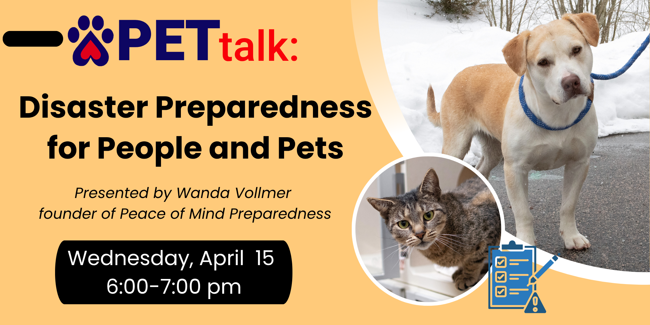 Virtual , United StatesJoin CT Humane Society and Wanda Vollmer of Peace of Mind Preparedness to learn how to better be prepared for the unimaginable. Emergencies in Connecticut take many forms. Winter storms, power outages, flooding, and more can quickly disrupt daily life for people and pets. This practical, engaging presentation explores simple preparedness steps that reduce stress, …