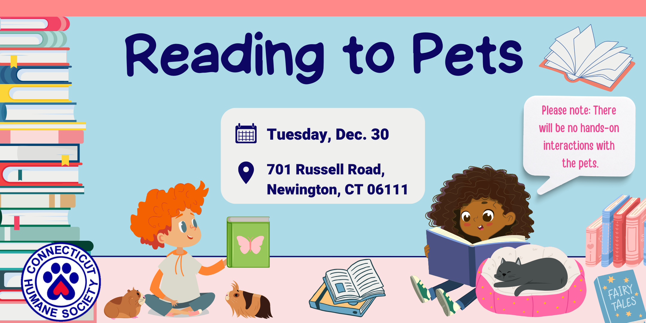 Connecticut Humane Society in Newington 701 Russell Road, Newington, CT, United StatesA purr-fect way to have your child practice their reading aloud skills: Sign up for a session of Reading to Pets at CT Humane Society. Join the Connecticut Humane Society …