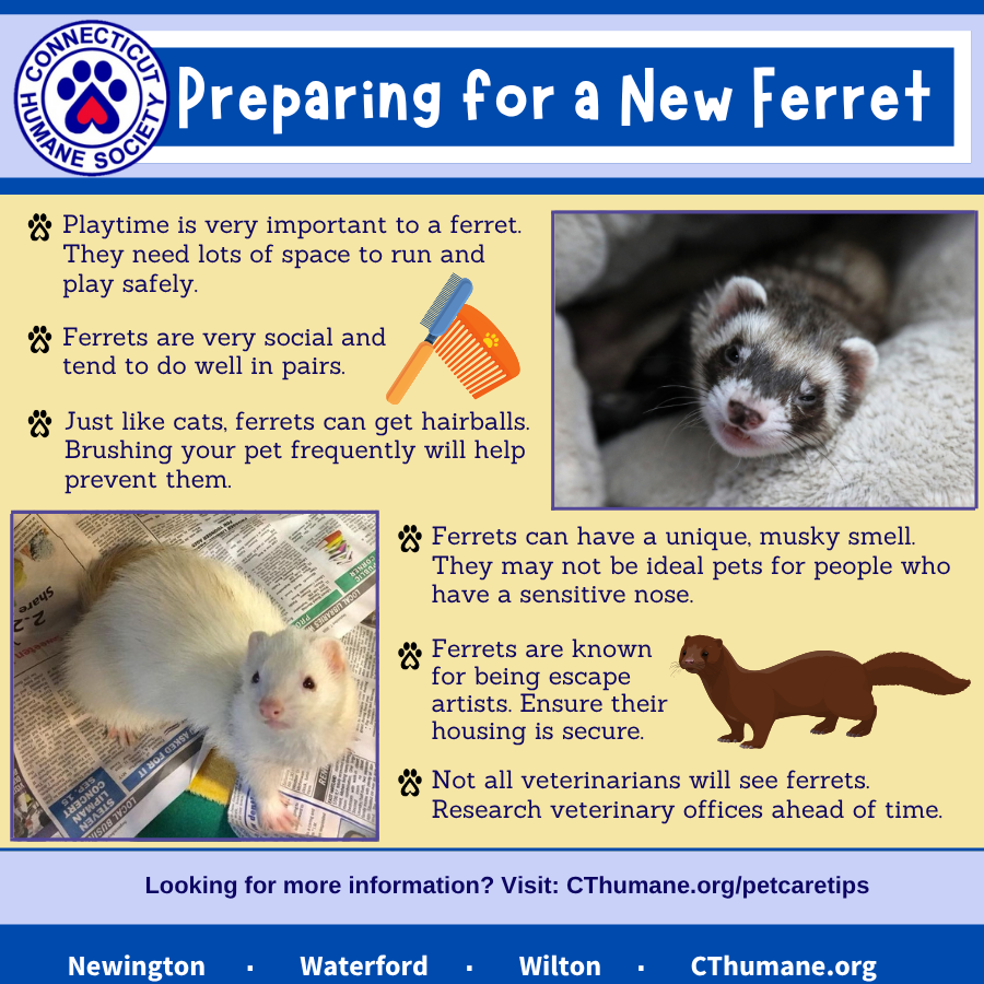 - Ferrets are very intelligent and love to explore. Be sure to provide a variety of toys, hammocks, and hiding places to keep them busy.